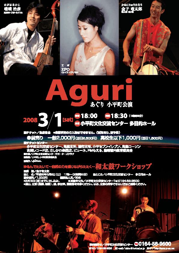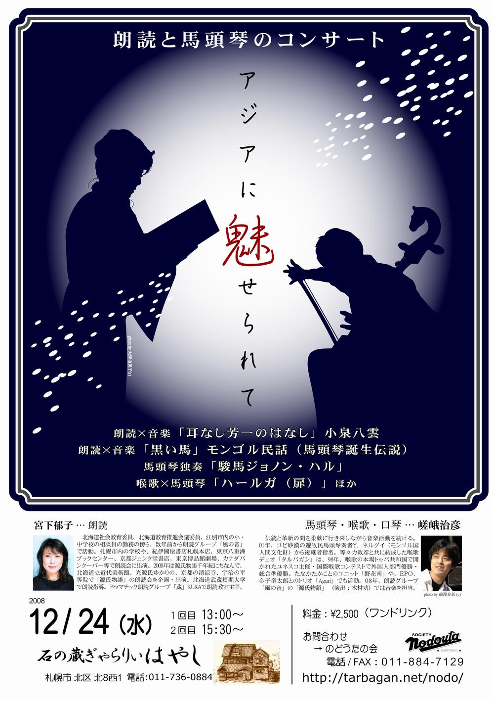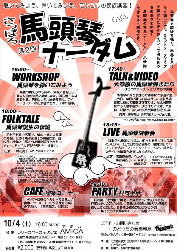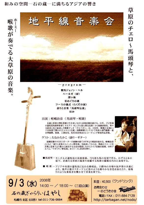 ○3/20(木・祝) 遊牧の民の調べ−馬頭琴とドンブラ− 〜はてなき大地 いま吹くアジアの風 感じる〜 18:00〜 フェアトレード雑貨&レストラン「みんたる」(札幌市北区北14条西3丁目1-1)出演: ヨンドル・ネルグイ(馬頭琴)自分の耳だけをたよりに曲をアレンジし、馬頭琴を自在に弾きこなすゴビの天才 奏者。モンゴル国第一文化功労賞、北極星勲章(文化賞最高勲章)授与。リヤス・クグルシン(ドンブラ)モンゴル最西端バヤンウルギー在住のカザフ人。医師でありながら、カザフ民族 楽器ドンブラの名手、歌い人として名が知れる。西村幹也モンゴル語を学び、「モンゴル」を人々に伝える日々。帯広大谷短大講師。(今 回の演奏ツアーのプロモーターであり、コンサートで曲紹介担当)料金:\2,000(1ドリンク) 当日\500増 詳細:http://shagaa.com/終了後は出演者を囲んで余韻パーティー(\1,500で料理とワンドリンク付き)♪♪おなじみ、ゴビの天才ネルグイさん&歌うカザフ・ダンディ=クグルシンさんモンゴル情報紙「しゃがぁ」の西村さんのトリオの日本ツアー。 今年の札幌公演はみんたるで開催ですよー!。 |