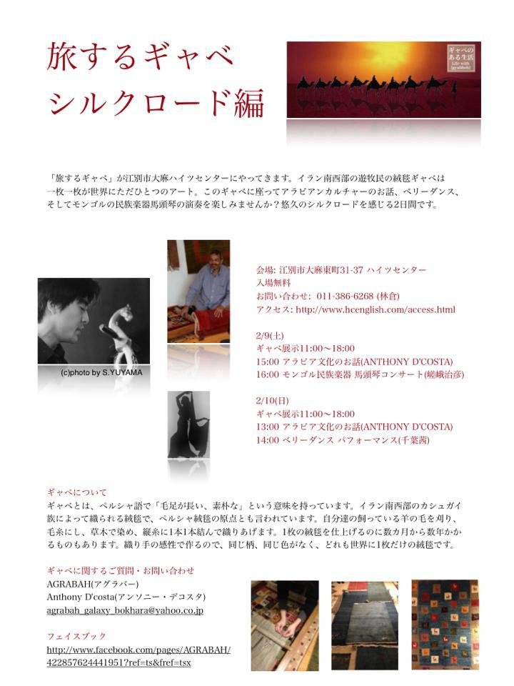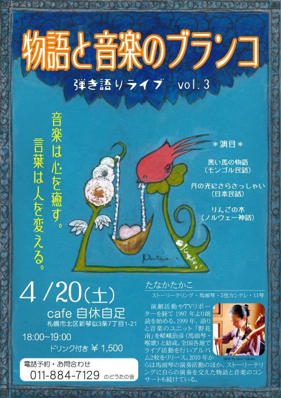 ●11/2(土) 開局15周年記念 三角山ミュージックフェスティバル 第二夜「アラウンド・ザ・ワールド・ミュージック」開場17:30 開演18:00(2時間半程度) レンガの館ホール(西区八軒1条西1丁目2-5) 出演: あらひろこ[カンテレ]、岡田浩安[ケーナ、サンポーニャ]、RINKA(小松崎操[フィドル]、星直樹[ギター])、 森末雅子[フォルクローレ]、松田ヒシゲスレン[詩、歌]、武部未来とチェアフラサークル[フラ]、 嵯峨治彦[馬、喉] 料金:前売3,000円、当日3,500円(全席自由) チケット取扱:三角山放送局、ほか |
