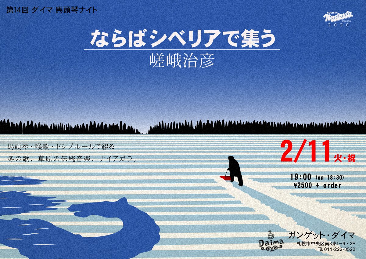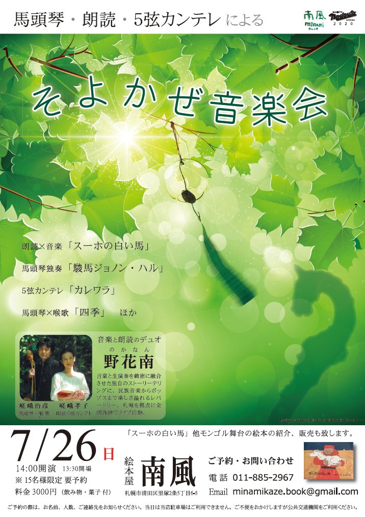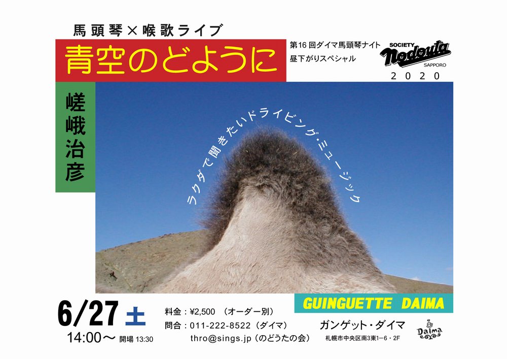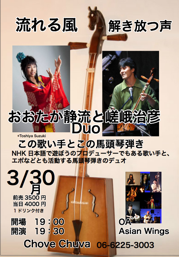 ● 嵯峨治彦ソロ、タルバガン、Aguri、野花南ほかのライブ情報。 ○ 馬頭琴・喉歌等の関連イベント情報。 内容は予告なく変更になる場合もありますので事前にご確認頂くと安心です。 お問い合わせ → のどうたの会 事務局 |