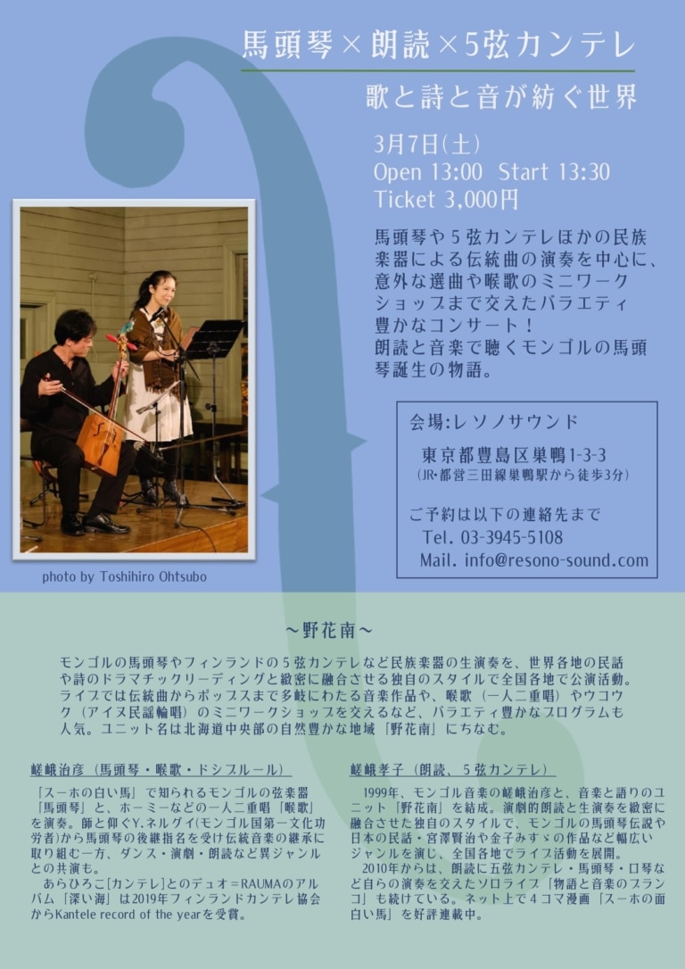 ●3/7(土)馬頭琴×朗読×5弦カンテレ〜歌と詩と音が紡ぐ世界〜