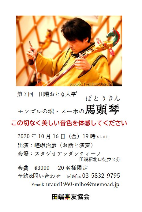 ●10/16(金) 第7回 田端おとな大学 「モンゴルの魂・スーホの馬頭琴」